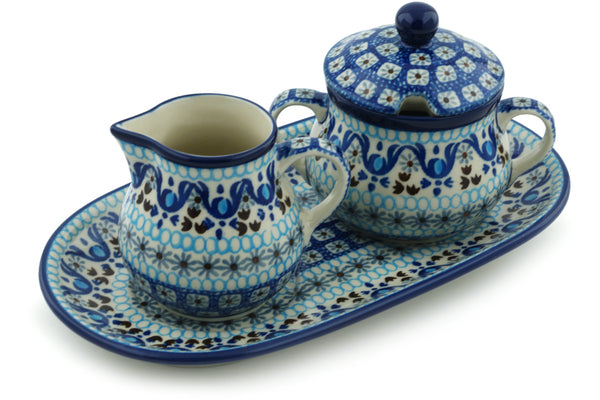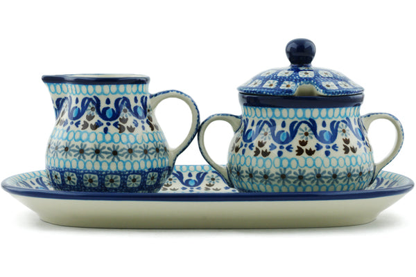 This Blue Ice 10" Sugar and Creamer Set was handmade and hand decorated in Boleslawiec, Poland by skilled artisans according to old traditional methods. This Polish stoneware is microwave, dishwasher, freezer, and oven safe up to 480°F. It does not contain lead or cadmium. It is part of the Blue Ice Collection.