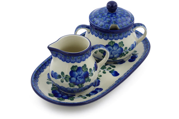 This Blue Poppies 10" Sugar and Creamer Set was handmade and hand decorated in Boleslawiec, Poland by skilled artisans according to old traditional methods. This Polish stoneware is microwave, dishwasher, freezer, and oven safe up to 480°F. It does not contain lead or cadmium. It is part of the Blue Poppies Collection.