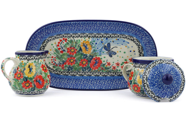 This Dragonfly Meadow 10" Sugar and Creamer Set was handmade and hand decorated in Boleslawiec, Poland by skilled artisans according to old traditional methods. This is a Polish pottery Signature Unikat, which means that it has been hand painted with both sponges and brushes and it is signed by the artist who painted it. Unikat pieces are the most intricate works of art. Larger Unikat items take hours of very careful work to finish. This Polish stoneware is microwave, dishwasher, freezer, and oven safe up to 480°F. It does not contain lead or cadmium. It is part of the Dragonfly Meadow Collection.