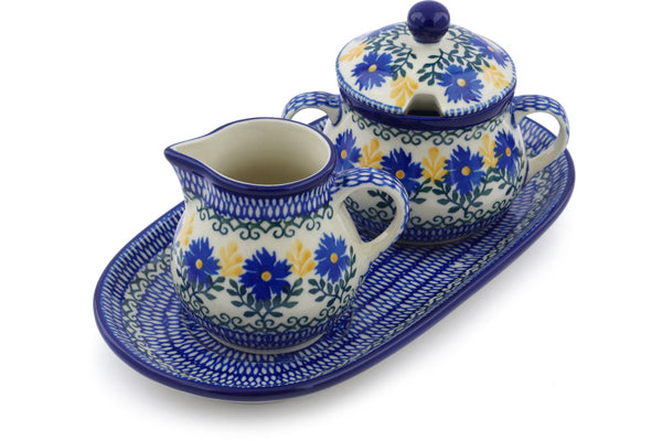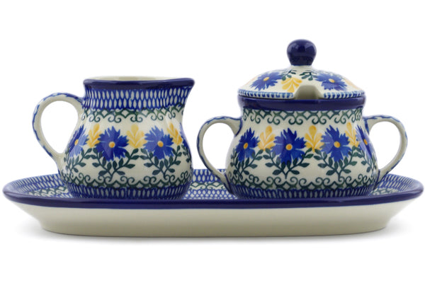 This Royal Daisy 10" Sugar and Creamer Set was handmade and hand decorated in Boleslawiec, Poland by skilled artisans according to old traditional methods. This Polish stoneware is microwave, dishwasher, freezer, and oven safe up to 480°F. It does not contain lead or cadmium. It is part of the Royal Daisy Collection.