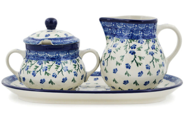 This Cascading Blue Blossoms 11" Sugar and Creamer Set was handmade and hand decorated in Boleslawiec, Poland by skilled artisans according to old traditional methods. This Polish stoneware is microwave, dishwasher, freezer, and oven safe up to 480°F. It does not contain lead or cadmium. It is part of the Cascading Blue Blossoms Collection.