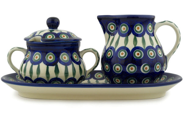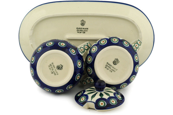 This Peacock Leaves 11" Sugar and Creamer Set was handmade and hand decorated in Boleslawiec, Poland by skilled artisans according to old traditional methods. This Polish stoneware is microwave, dishwasher, freezer, and oven safe up to 480°F. It does not contain lead or cadmium. It is part of the Peacock Leaves Collection.