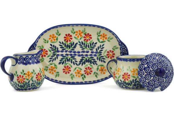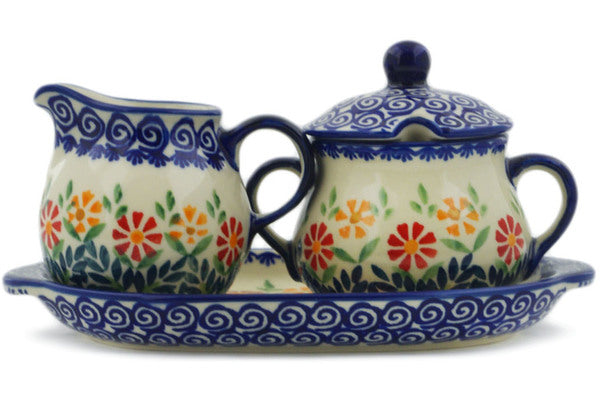 This Wave Of Flowers 9" Sugar and Creamer Set was handmade and hand decorated in Boleslawiec, Poland by skilled artisans according to old traditional methods. This Polish stoneware is microwave, dishwasher, freezer, and oven safe up to 480°F. It does not contain lead or cadmium. It is part of the Wave Of Flowers Collection.