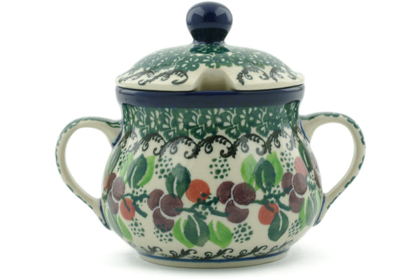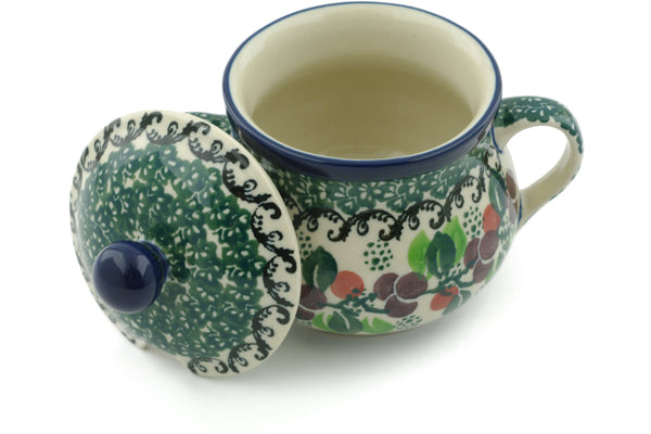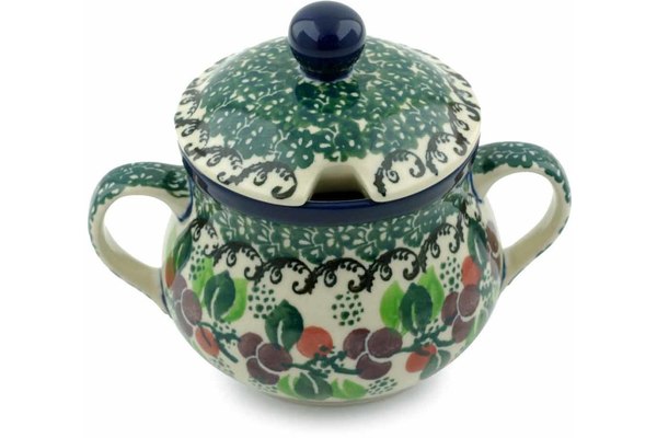 This Berry Garland 7 oz Sugar Bowl was handmade and hand decorated in Boleslawiec, Poland by skilled artisans according to old traditional methods. This Polish stoneware is microwave, dishwasher, freezer, and oven safe up to 480°F. It does not contain lead or cadmium. It is part of the Berry Garland Collection.