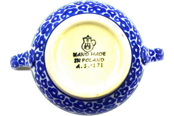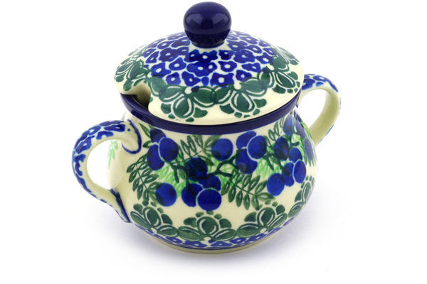 This Blueberry Fields Forever 7 oz Sugar Bowl was handmade and hand decorated in Boleslawiec, Poland by skilled artisans according to old traditional methods. This Polish stoneware is microwave, dishwasher, freezer, and oven safe up to 480°F. It does not contain lead or cadmium. It is part of the Blueberry Fields Forever Collection.