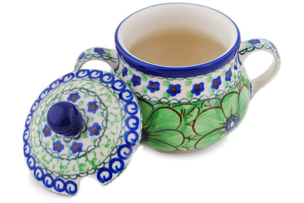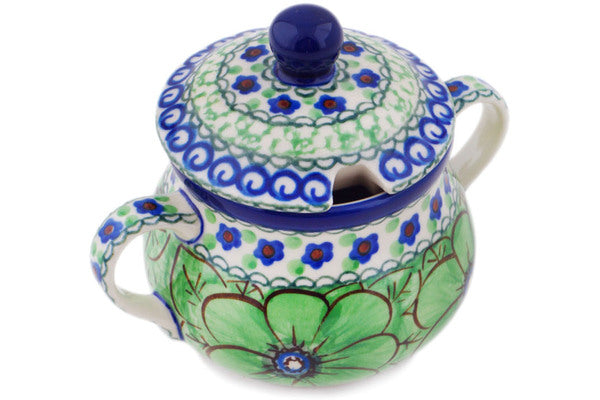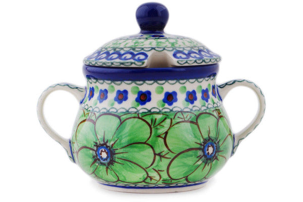 This Green Pansies 7 oz Sugar Bowl was handmade and hand decorated in Boleslawiec, Poland by skilled artisans according to old traditional methods. This is a Polish pottery Signature Unikat, which means that it has been hand painted with both sponges and brushes and it is signed by the artist who painted it. Unikat pieces are the most intricate works of art. Larger Unikat items take hours of very careful work to finish. This Polish stoneware is microwave, dishwasher, freezer, and oven safe up to 480°F. It does not contain lead or cadmium. It is part of the Green Pansies Collection.