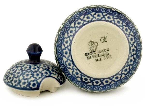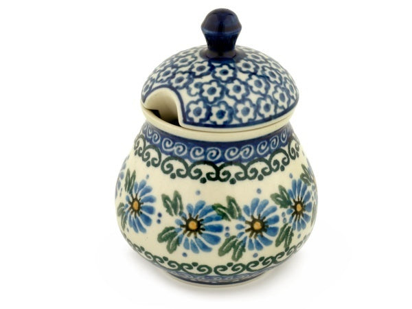 This Marigold Morning 8 oz Sugar Bowl was handmade and hand decorated in Boleslawiec, Poland by skilled artisans according to old traditional methods. This Polish stoneware is microwave, dishwasher, freezer, and oven safe up to 480°F. It does not contain lead or cadmium. It is part of the Marigold Morning Collection.