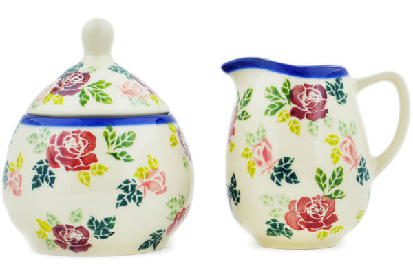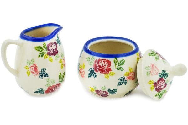 This Vintage Rose Sugar Bowl and Creamer was handmade and hand decorated in Boleslawiec, Poland by skilled artisans according to old traditional methods. This Polish stoneware is microwave, dishwasher, freezer, and oven safe up to 480°F. It does not contain lead or cadmium. It is part of the Vintage Rose Collection.