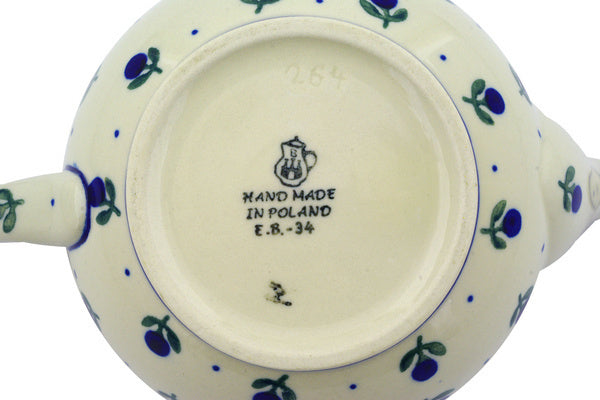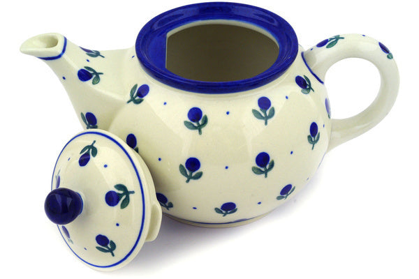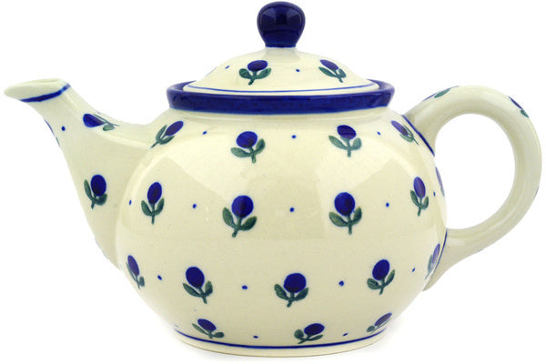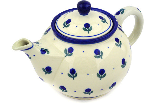 This Blue Buds 3½ cups Tea or Coffee Pot was handmade and hand decorated in Boleslawiec, Poland by skilled artisans according to old traditional methods. This Polish stoneware is microwave, dishwasher, freezer, and oven safe up to 480°F. It does not contain lead or cadmium. It is part of the Blue Buds Collection.