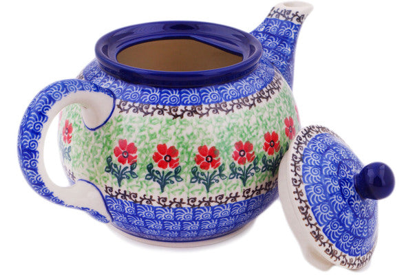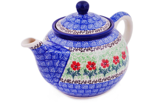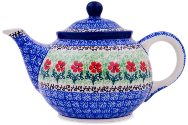 This Maraschino 3½ cups Tea or Coffee Pot was handmade and hand decorated in Boleslawiec, Poland by skilled artisans according to old traditional methods. This Polish stoneware is microwave, dishwasher, freezer, and oven safe up to 480°F. It does not contain lead or cadmium. It is part of the Maraschino Collection.