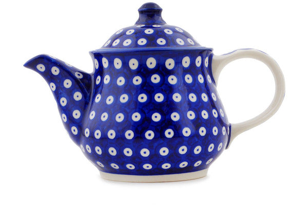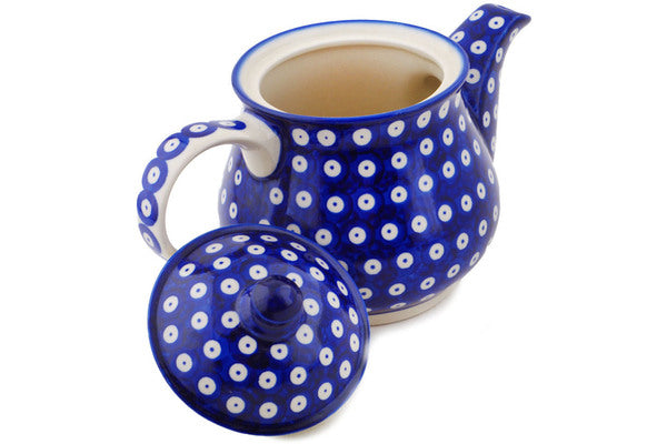 This Blue Eyed Peacock 38 oz Tea or Coffee Pot was handmade and hand decorated in Boleslawiec, Poland by skilled artisans according to old traditional methods. This Polish stoneware is microwave, dishwasher, freezer, and oven safe up to 480°F. It does not contain lead or cadmium. It is part of the Blue Eyed Peacock Collection.