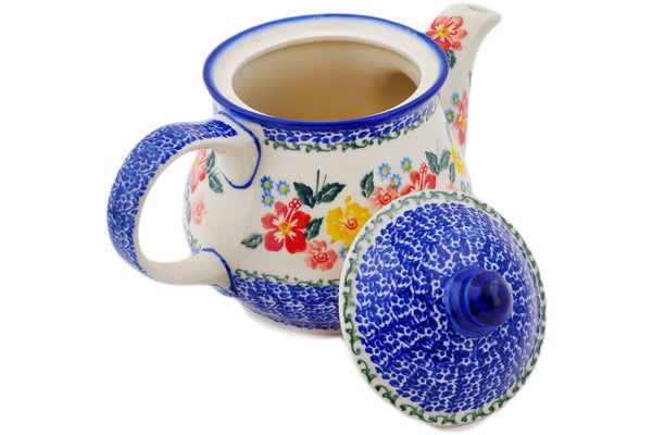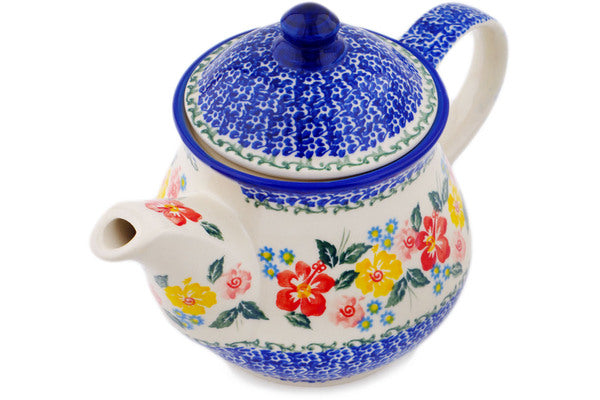 This Hibiscus Haven 38 oz Tea or Coffee Pot was handmade and hand decorated in Boleslawiec, Poland by skilled artisans according to old traditional methods. This Polish stoneware is microwave, dishwasher, freezer, and oven safe up to 480°F. It does not contain lead or cadmium. It is part of the Hibiscus Haven Collection.
