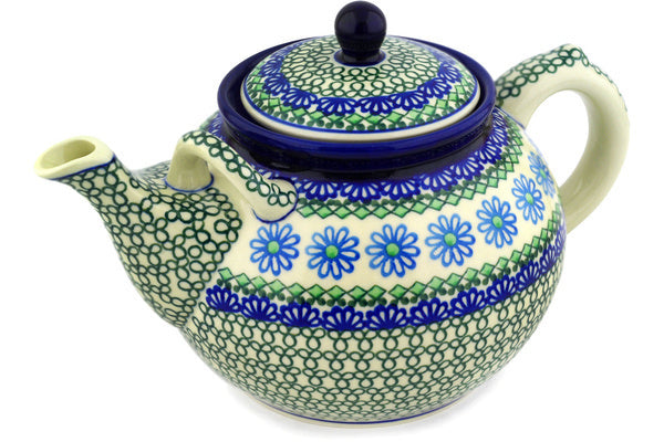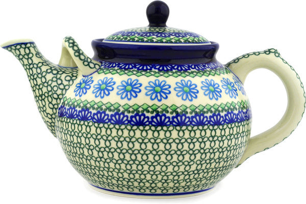 This Geometric Daisies 7 cups Tea or Coffee Pot was handmade and hand decorated in Boleslawiec, Poland by skilled artisans according to old traditional methods. This Polish stoneware is microwave, dishwasher, freezer, and oven safe up to 480°F. It does not contain lead or cadmium. It is part of the Geometric Daisies Collection.