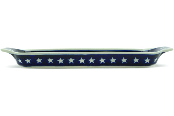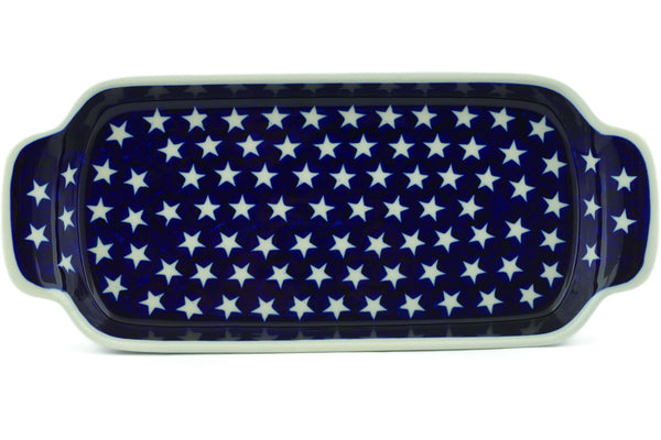 This America The Beautiful 12-inch Tray with Handles was handmade and hand decorated in Boleslawiec, Poland by skilled artisans according to old traditional methods. This Polish stoneware is microwave, dishwasher, freezer, and oven safe up to 480°F. It does not contain lead or cadmium. It is part of the America The Beautiful Collection.