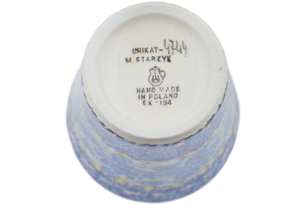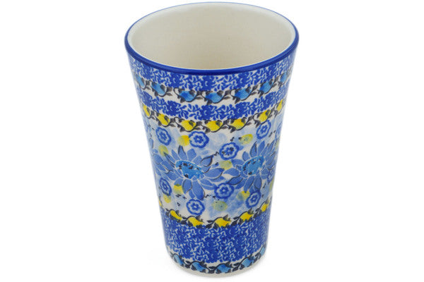 This Deep Blue 12 oz Tumbler was handmade and hand decorated in Boleslawiec, Poland by skilled artisans according to old traditional methods. This is a Polish pottery Signature Unikat, which means that it has been hand painted with both sponges and brushes and it is signed by the artist who painted it. Unikat pieces are the most intricate works of art. Larger Unikat items take hours of very careful work to finish. This Polish stoneware is microwave, dishwasher, freezer, and oven safe up to 480°F. It does not contain lead or cadmium. It is part of the Deep Blue Collection.