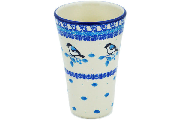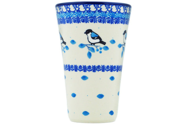 This Winter Sparrow 12 oz Tumbler was handmade and hand decorated in Boleslawiec, Poland by skilled artisans according to old traditional methods. This Polish stoneware is microwave, dishwasher, freezer, and oven safe up to 480°F. It does not contain lead or cadmium. It is part of the Winter Sparrow Collection.