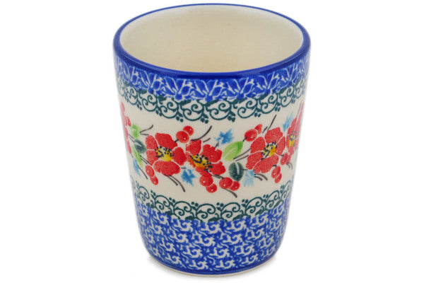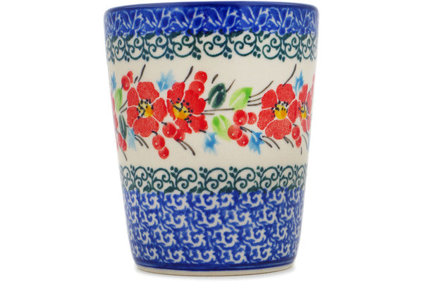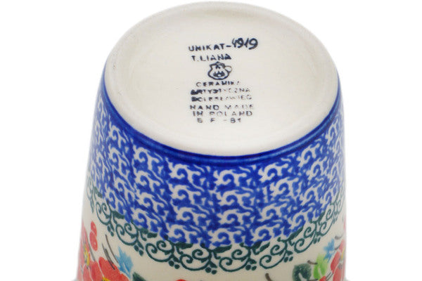 This Cherry Colored Florals 9 oz Tumbler was handmade and hand decorated in Boleslawiec, Poland by skilled artisans according to old traditional methods. This is a Polish pottery Signature Unikat, which means that it has been hand painted with both sponges and brushes and it is signed by the artist who painted it. Unikat pieces are the most intricate works of art. Larger Unikat items take hours of very careful work to finish. This Polish stoneware is microwave, dishwasher, freezer, and oven safe up to 480°F. It does not contain lead or cadmium. It is part of the Cherry Colored Florals Collection.