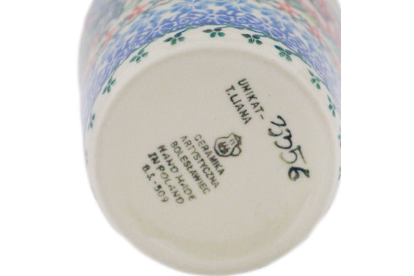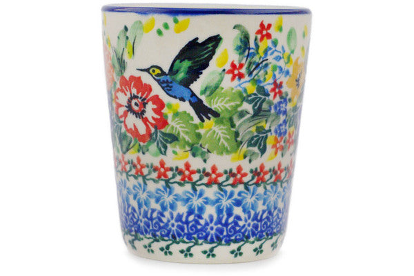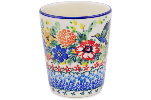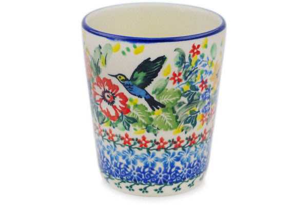 This Hummingbird Meadow 9 oz Tumbler was handmade and hand decorated in Boleslawiec, Poland by skilled artisans according to old traditional methods. This is a Polish pottery Signature Unikat, which means that it has been hand painted with both sponges and brushes and it is signed by the artist who painted it. Unikat pieces are the most intricate works of art. Larger Unikat items take hours of very careful work to finish. This Polish stoneware is microwave, dishwasher, freezer, and oven safe up to 480°F. It does not contain lead or cadmium. It is part of the Hummingbird Meadow Collection.