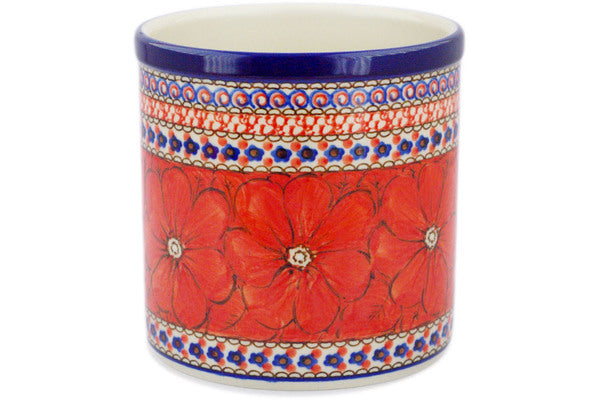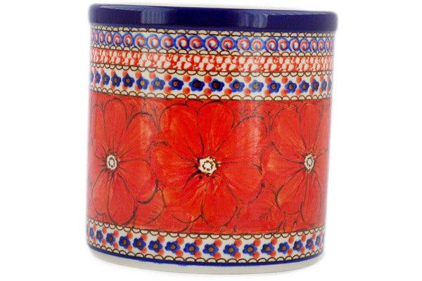 This Crimson Poppies 6" Utensil Jar was handmade and hand decorated in Boleslawiec, Poland by skilled artisans according to old traditional methods. This is a Polish pottery Signature Unikat, which means that it has been hand painted with both sponges and brushes and it is signed by the artist who painted it. Unikat pieces are the most intricate works of art. Larger Unikat items take hours of very careful work to finish. This Polish stoneware is microwave, dishwasher, freezer, and oven safe up to 480°F. It does not contain lead or cadmium. It is part of the Crimson Poppies Collection.