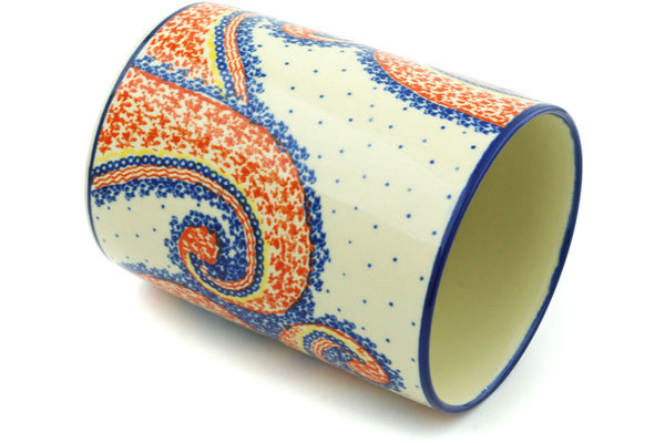 This Spiral Joy 7" Utensil Jar was handmade and hand decorated in Boleslawiec, Poland by skilled artisans according to old traditional methods. This is a Polish pottery Signature Unikat, which means that it has been hand painted with both sponges and brushes and it is signed by the artist who painted it. Unikat pieces are the most intricate works of art. Larger Unikat items take hours of very careful work to finish. This Polish stoneware is microwave, dishwasher, freezer, and oven safe up to 480°F. It does not contain lead or cadmium. It is part of the Spiral Joy Collection.