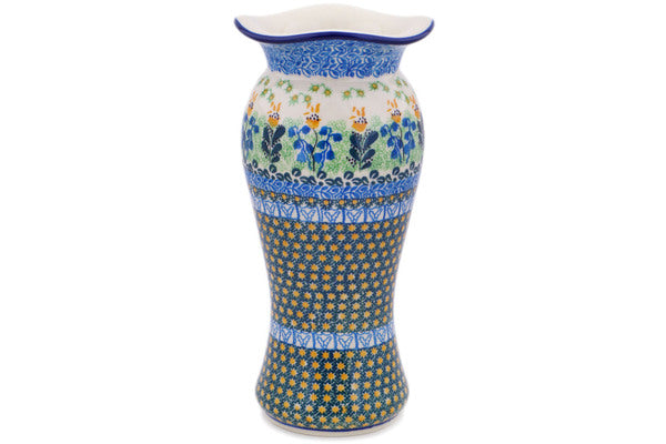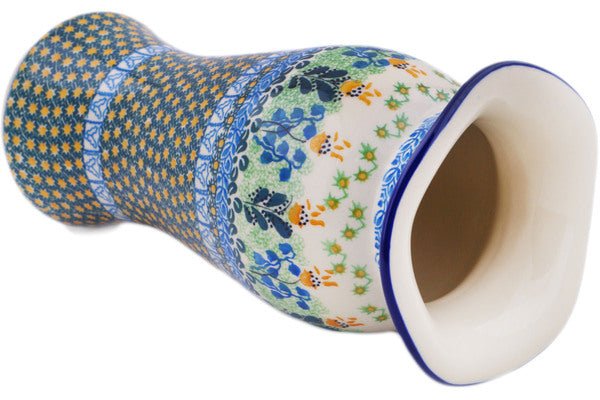 This Bluebells And Irises 11" Vase was handmade and hand decorated in Boleslawiec, Poland by skilled artisans according to old traditional methods. This is a Polish pottery Signature Unikat, which means that it has been hand painted with both sponges and brushes and it is signed by the artist who painted it. Unikat pieces are the most intricate works of art. Larger Unikat items take hours of very careful work to finish. This Polish stoneware is microwave, dishwasher, freezer, and oven safe up to 480°F. It does not contain lead or cadmium. It is part of the Bluebells And Irises Collection.