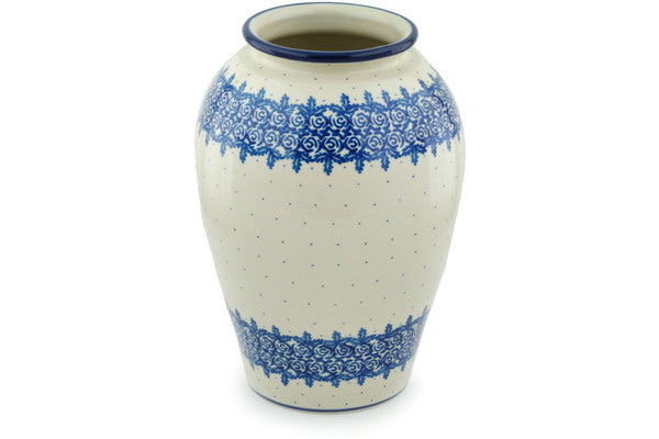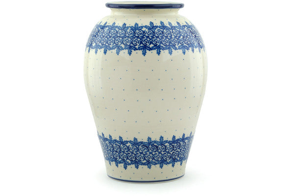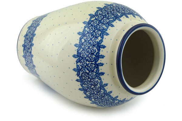 This Blue Rosebuds 12" Vase was handmade and hand decorated in Boleslawiec, Poland by skilled artisans according to old traditional methods. This is a Polish pottery Signature Unikat, which means that it has been hand painted with both sponges and brushes and it is signed by the artist who painted it. Unikat pieces are the most intricate works of art. Larger Unikat items take hours of very careful work to finish. This Polish stoneware is microwave, dishwasher, freezer, and oven safe up to 480°F. It does not contain lead or cadmium. It is part of the Blue Rosebuds Collection.