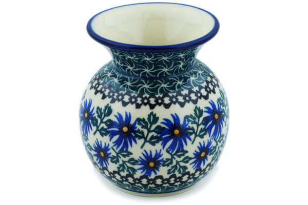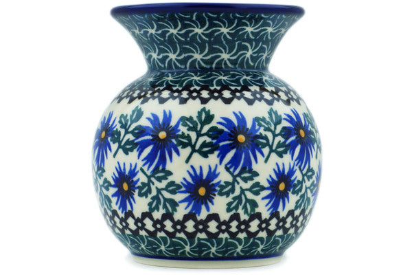 This Blue Chicory 4" Vase was handmade and hand decorated in Boleslawiec, Poland by skilled artisans according to old traditional methods. This Polish stoneware is microwave, dishwasher, freezer, and oven safe up to 480°F. It does not contain lead or cadmium. It is part of the Blue Chicory Collection.