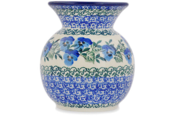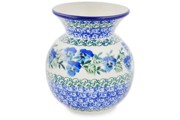 This Blue Pansy 4" Vase was handmade and hand decorated in Boleslawiec, Poland by skilled artisans according to old traditional methods. This Polish stoneware is microwave, dishwasher, freezer, and oven safe up to 480°F. It does not contain lead or cadmium. It is part of the Blue Pansy Collection.