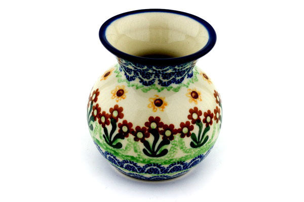 This Brown Daisy Dance 4" Vase was handmade and hand decorated in Boleslawiec, Poland by skilled artisans according to old traditional methods. This Polish stoneware is microwave, dishwasher, freezer, and oven safe up to 480°F. It does not contain lead or cadmium. It is part of the Brown Daisy Dance Collection.