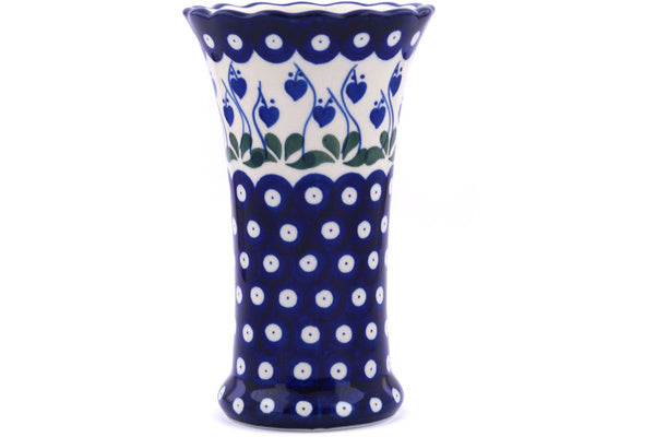 This Bleeding Heart Peacock 7" Vase was handmade and hand decorated in Boleslawiec, Poland by skilled artisans according to old traditional methods. This Polish stoneware is microwave, dishwasher, freezer, and oven safe up to 480°F. It does not contain lead or cadmium. It is part of the Bleeding Heart Peacock Collection.