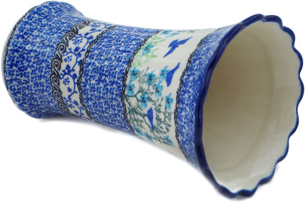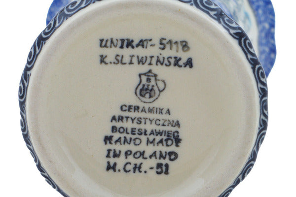 This Blue Bird Flying 7" Vase was handmade and hand decorated in Boleslawiec, Poland by skilled artisans according to old traditional methods. This is a Polish pottery Signature Unikat, which means that it has been hand painted with both sponges and brushes and it is signed by the artist who painted it. Unikat pieces are the most intricate works of art. Larger Unikat items take hours of very careful work to finish. This Polish stoneware is microwave, dishwasher, freezer, and oven safe up to 480°F. It does not contain lead or cadmium. It is part of the Blue Bird Flying Collection.