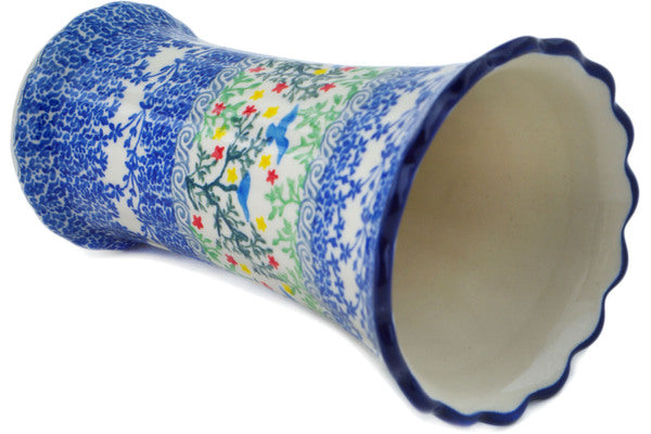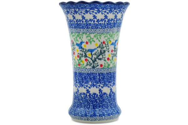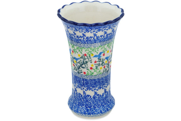This Free Flock 7" Vase was handmade and hand decorated in Boleslawiec, Poland by skilled artisans according to old traditional methods. This is a Polish pottery Signature Unikat, which means that it has been hand painted with both sponges and brushes and it is signed by the artist who painted it. Unikat pieces are the most intricate works of art. Larger Unikat items take hours of very careful work to finish. This Polish stoneware is microwave, dishwasher, freezer, and oven safe up to 480°F. It does not contain lead or cadmium. It is part of the Free Flock Collection.