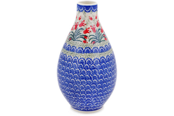 This Crimson Bells 8" Vase was handmade and hand decorated in Boleslawiec, Poland by skilled artisans according to old traditional methods. This Polish stoneware is microwave, dishwasher, freezer, and oven safe up to 480°F. It does not contain lead or cadmium. It is part of the Crimson Bells Collection.