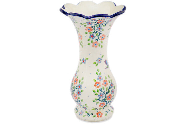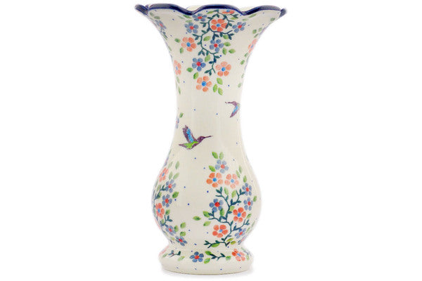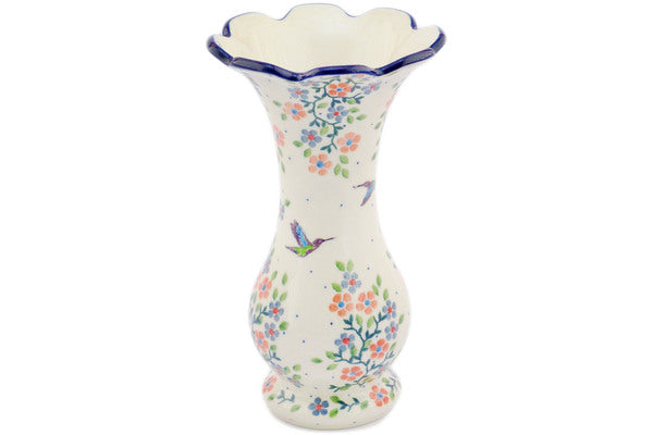 This Verdant Hummingbird Spring 9" Vase was handmade and hand decorated in Boleslawiec, Poland by skilled artisans according to old traditional methods. This is a Polish pottery Signature Unikat, which means that it has been hand painted with both sponges and brushes and it is signed by the artist who painted it. Unikat pieces are the most intricate works of art. Larger Unikat items take hours of very careful work to finish. This Polish stoneware is microwave, dishwasher, freezer, and oven safe up to 480°F. It does not contain lead or cadmium. It is part of the Verdant Hummingbird Spring Collection.