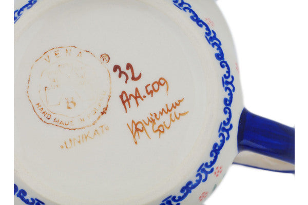 This Aster 23 oz Watering Can was handmade and hand decorated in Boleslawiec, Poland by skilled artisans according to old traditional methods. This is a Polish pottery Signature Unikat, which means that it has been hand painted with both sponges and brushes and it is signed by the artist who painted it. Unikat pieces are the most intricate works of art. Larger Unikat items take hours of very careful work to finish. This Polish stoneware is microwave, dishwasher, freezer, and oven safe up to 480°F. It does not contain lead or cadmium. It is part of the Aster Collection.